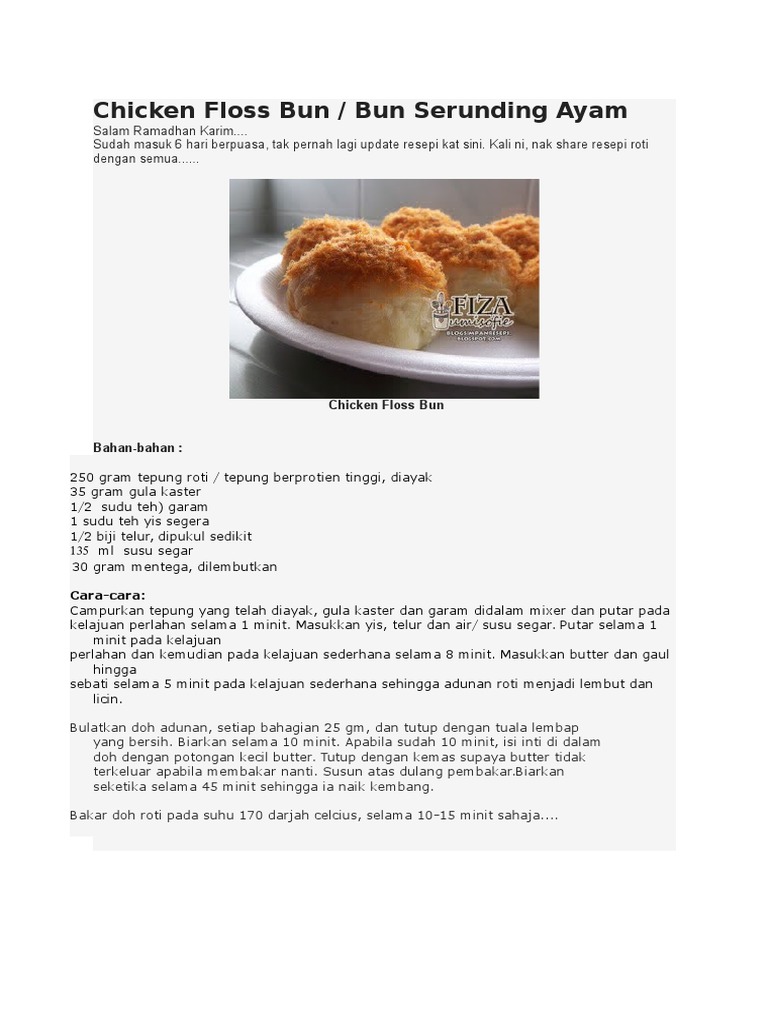 150 g Chicken Floss Langkah Satukan Satukan semua bahan untuk membuat roti kecuali Butter dan garam. Cabe merah besar potong kecil2. Menurut pemilik resepi ini kebiasaanya roti yang.